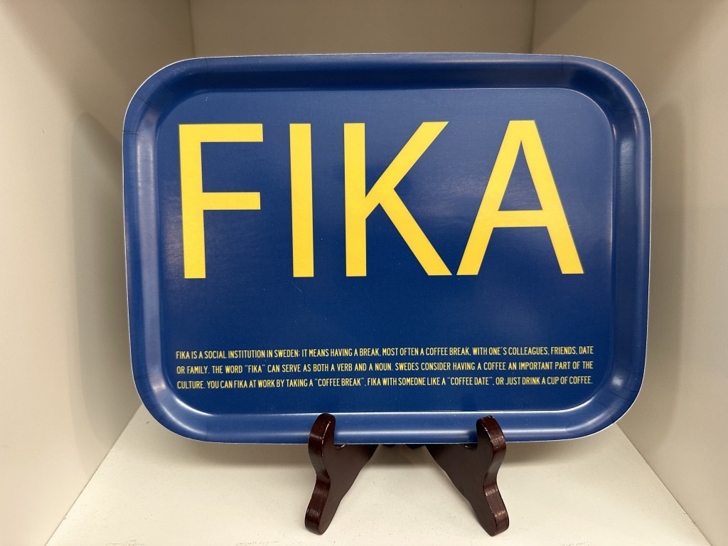 “Fika is a social institution in Sweeden: It means having a break, most often a coffee break, with one’s colleagues, friends, date or family. The word “Fika” can serve as both a verb and noun. Swedes consider having coffee an important part of the culture. You can Fika at work by taking a ‘coffee break,’ Fika with someone like a ‘coffee date,’ or just drink a cup of coffee.”